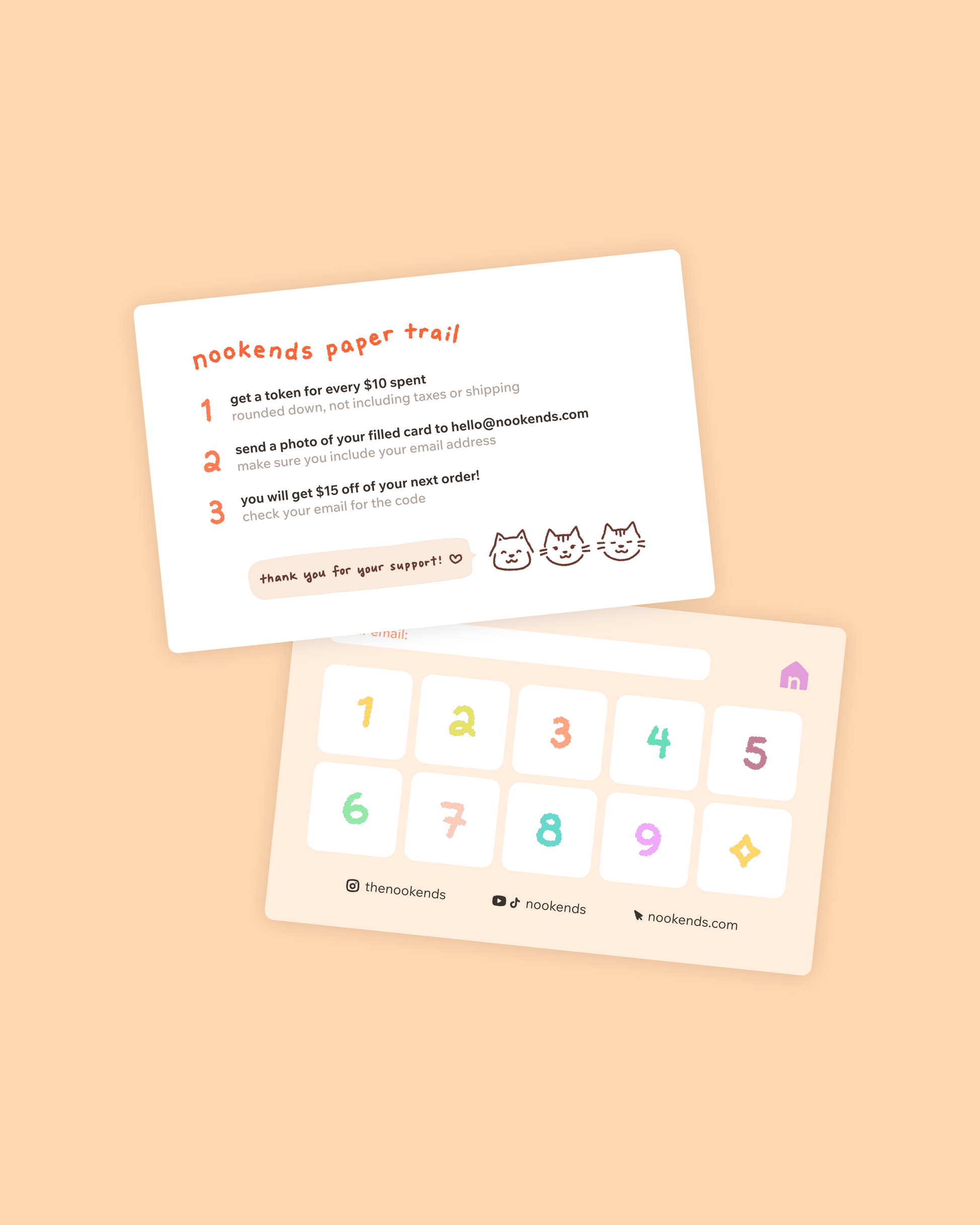 our loyalty program! get a token for every $10 you spend with us. once you have a full card, email us to get $15 off your next order.